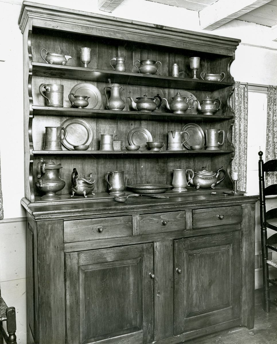 The dining hutch in the colonial kitchen of the Bush-Holley House with a variety of pewter dishes and tankards on display.Collection