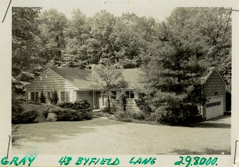 Colonial ranch house built in 1958 with shingle siding and a garage viewed from its lawn.