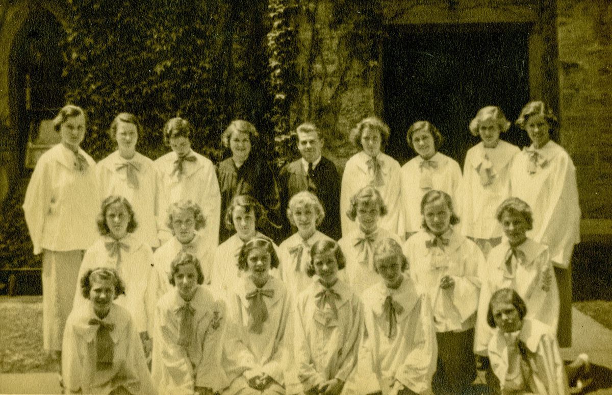 The Junior Choir of Second Congregational Church. From top left to right: Ruth Drake, Ruth Crosby, Betty Hawley, Betty Dodge, Frank Chatterton (church organist), Charlotte Green, Virginia Funston, Gertrude Crosby, Norma Hoyns; Second Row: Helen Berling, Jean Lindstrom, Anne Wright, Martha Kahle, Ruth Bergman, Margaret Bauer, Margaret Hull; First Row: Ruth Rose, Jacqueline Ferguson, Marion Crichton, Katherine Hull, Emily Hienikie, Elenore Chamberlain.Collection