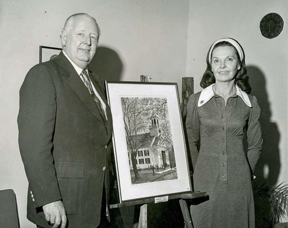 A man and woman posing with a lithograph of Wilton Congregational Church.
