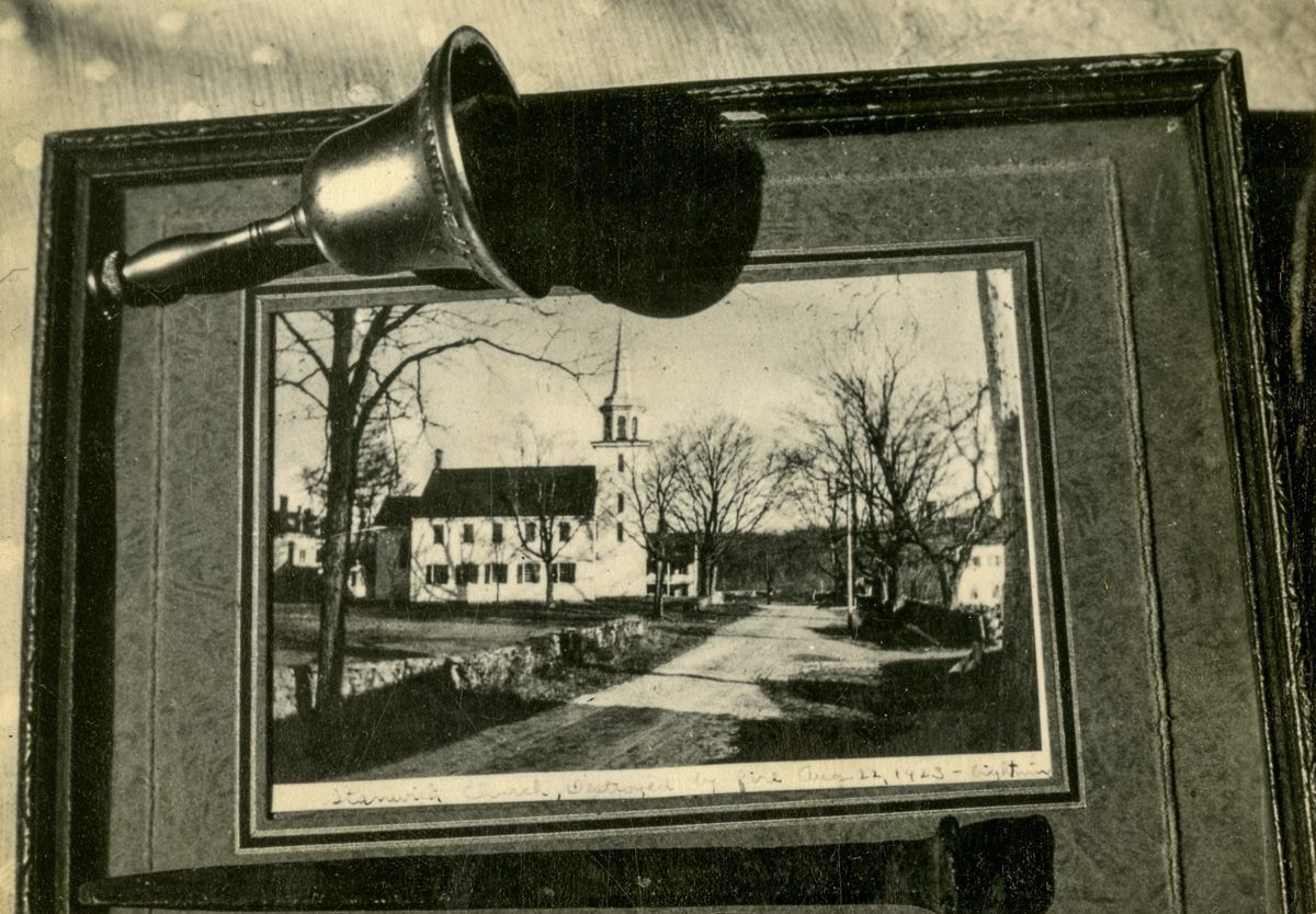Image of a photograph of Stanwich Congregational Church with a small bell resting on the frame.Collection
