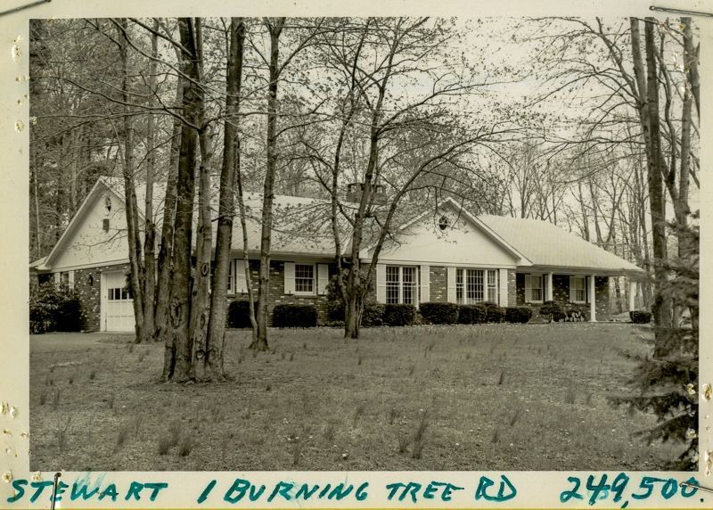 Ranch house built in 1964 with brick walls and a garage viewed from its lawn.