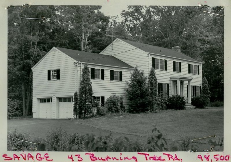 Colonial-style house built in 1961 with a two door garage viewed from its neighbor's lawn.