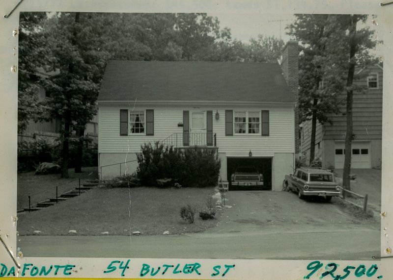 Cape Cod style house built in 1952 with a car parked in its garage and one in its driveway viewed from the street.Collection