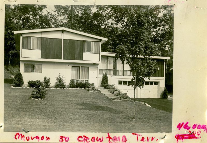 Contemporary split-level house built in 1964 with a two door garage viewed from the street.