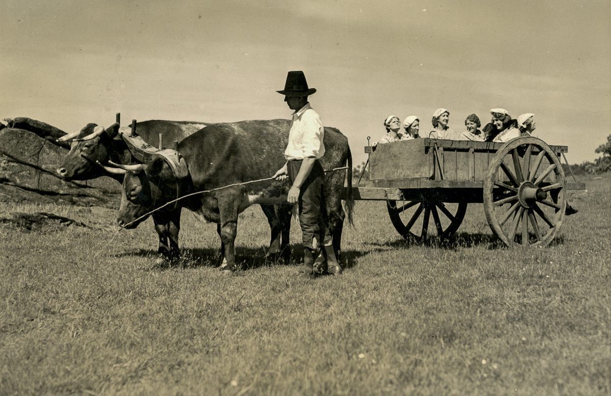 A group of women in Colonial-era costume taking a ride in an ox-cart as part of a "Patriotic pageant" celebrating the 300th Anniversary of Greenwich's Founding.Collection