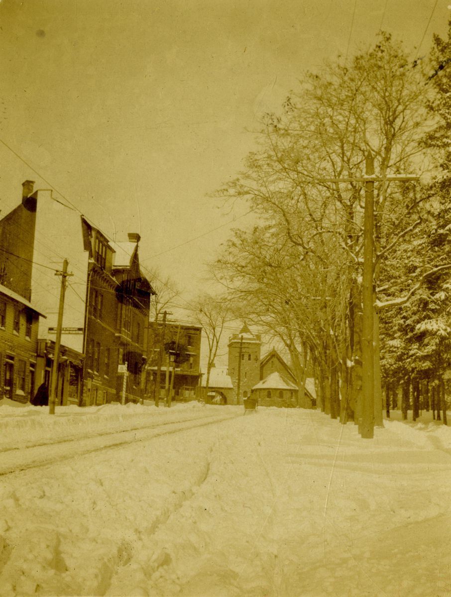 Looking up to the top of Greenwich Avenue in the winter of 1900; First Presbyterian Church is visible at the end of the road.Collection