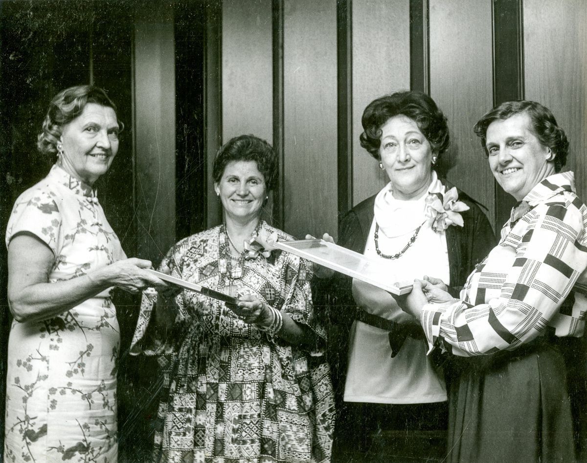 Four women posing with two framed awards.