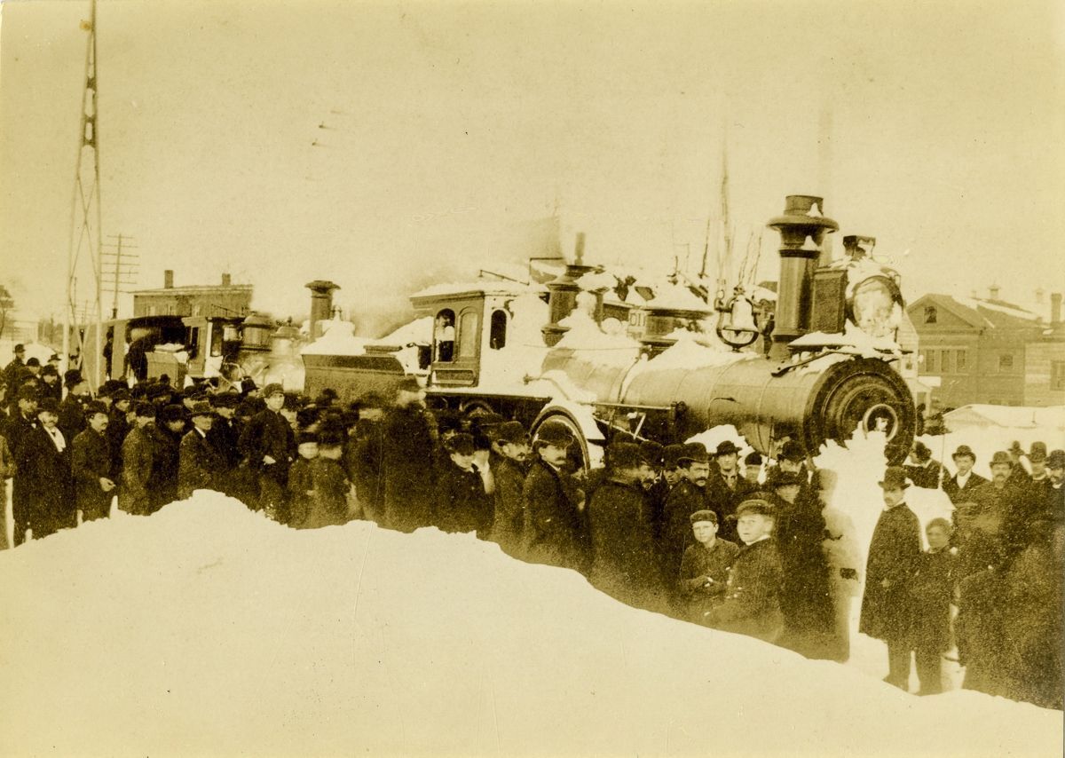 A group of people standing around a snowed-in locomotive after the March 12th and 13th Blizzard of 1888.Collection