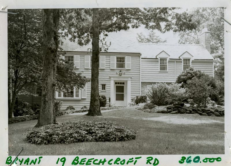 Two story colonial-style house built in 1948 viewed from its lawn.