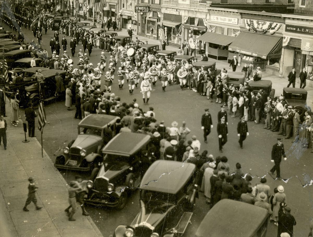 A marching band in the Tercentenary Parade on Greenwich Avenue.