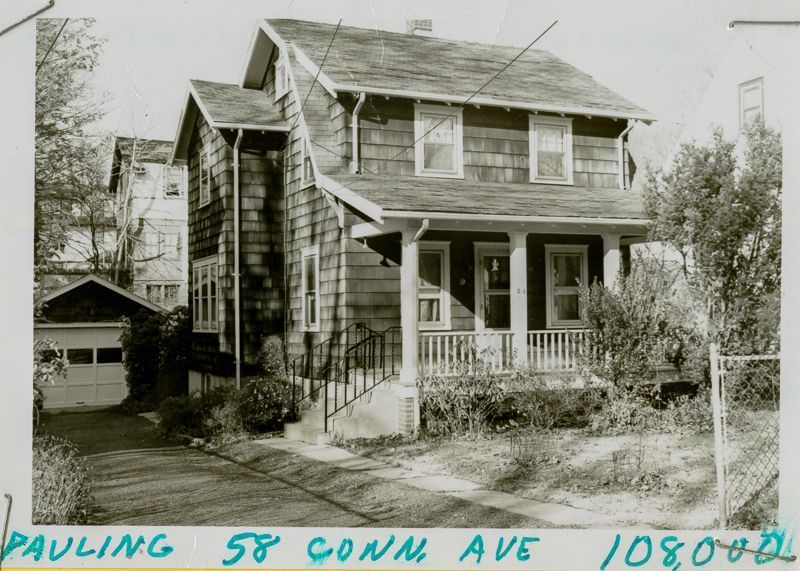 Colonial-style house built in 1929 with shingle siding and a garage at the and of its driveway viewed from the street.Collection