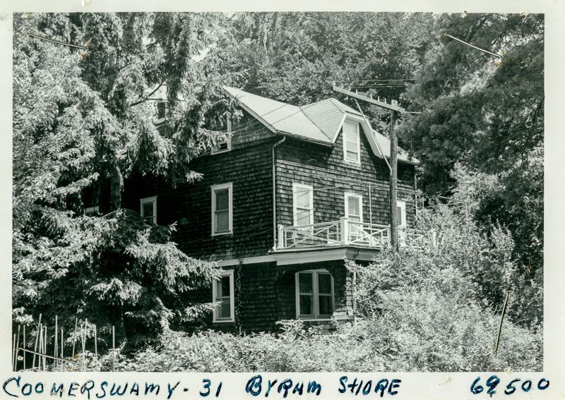 Colonial-style house built in 1924 with shingle siding viewed from its garden.