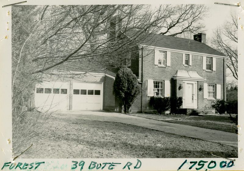 Two story brick house with a two-door garage built in 1947 viewed from the street.