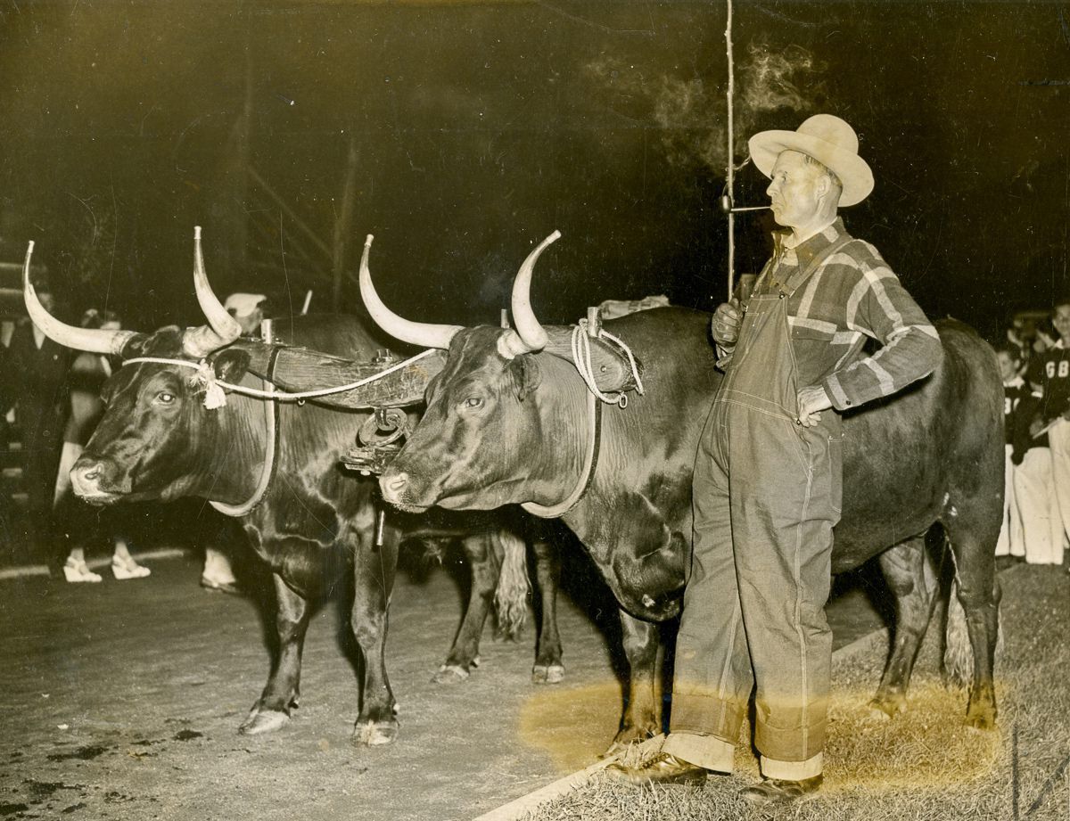 A man with two oxen in a pageant celebrating the 300th Anniversary of the Founding of Greenwich.Collection