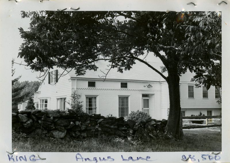 Two story house built in 1964 with a small stone wall in the foreground of the image.