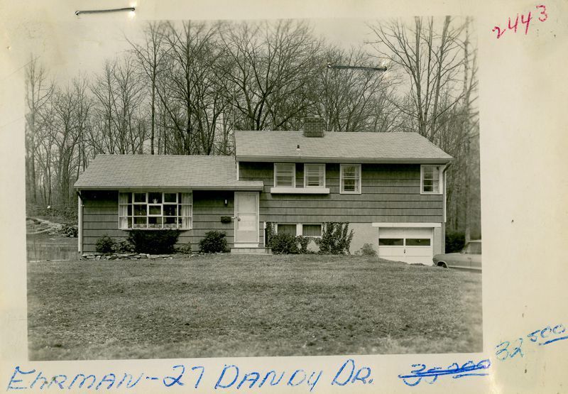 Split-level house built in 1956 or 1957 viewed from its lawn.