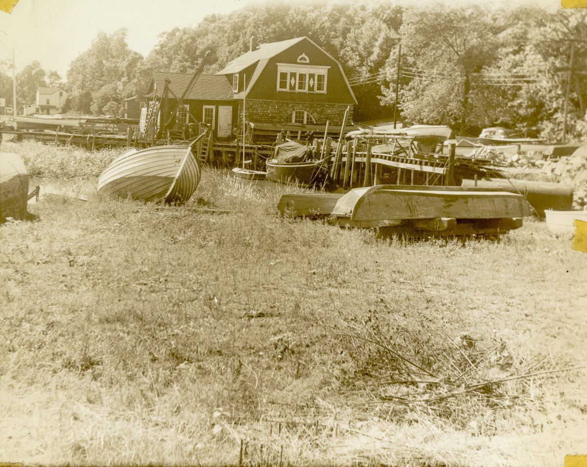 View of the Old Greenwich boatyard with a number of small boats in dry dock and pulled up onto a field.Collection