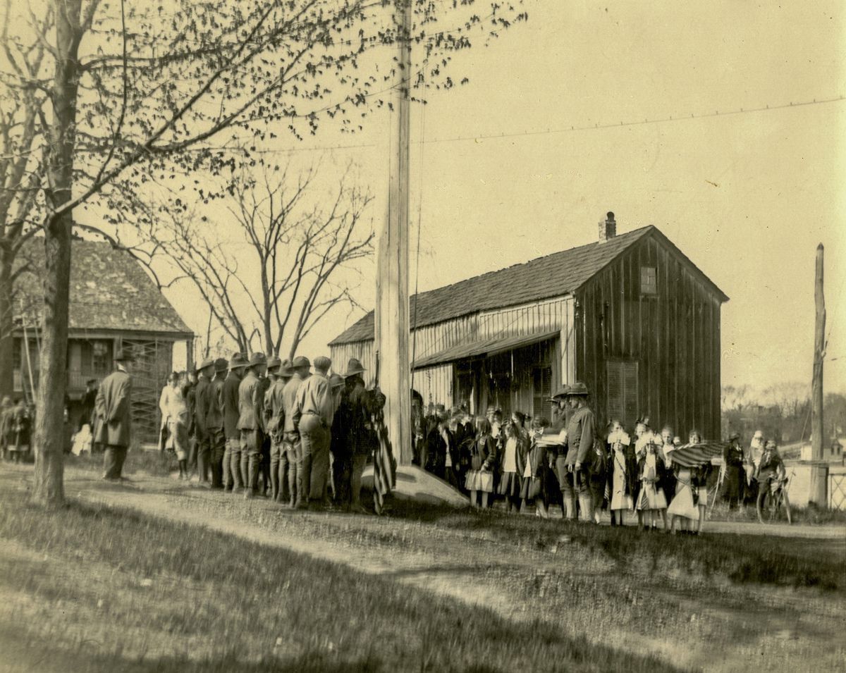 A crowd of people raising a flag on the Liberty Pole that stood at the end of Strickland Road.Collection