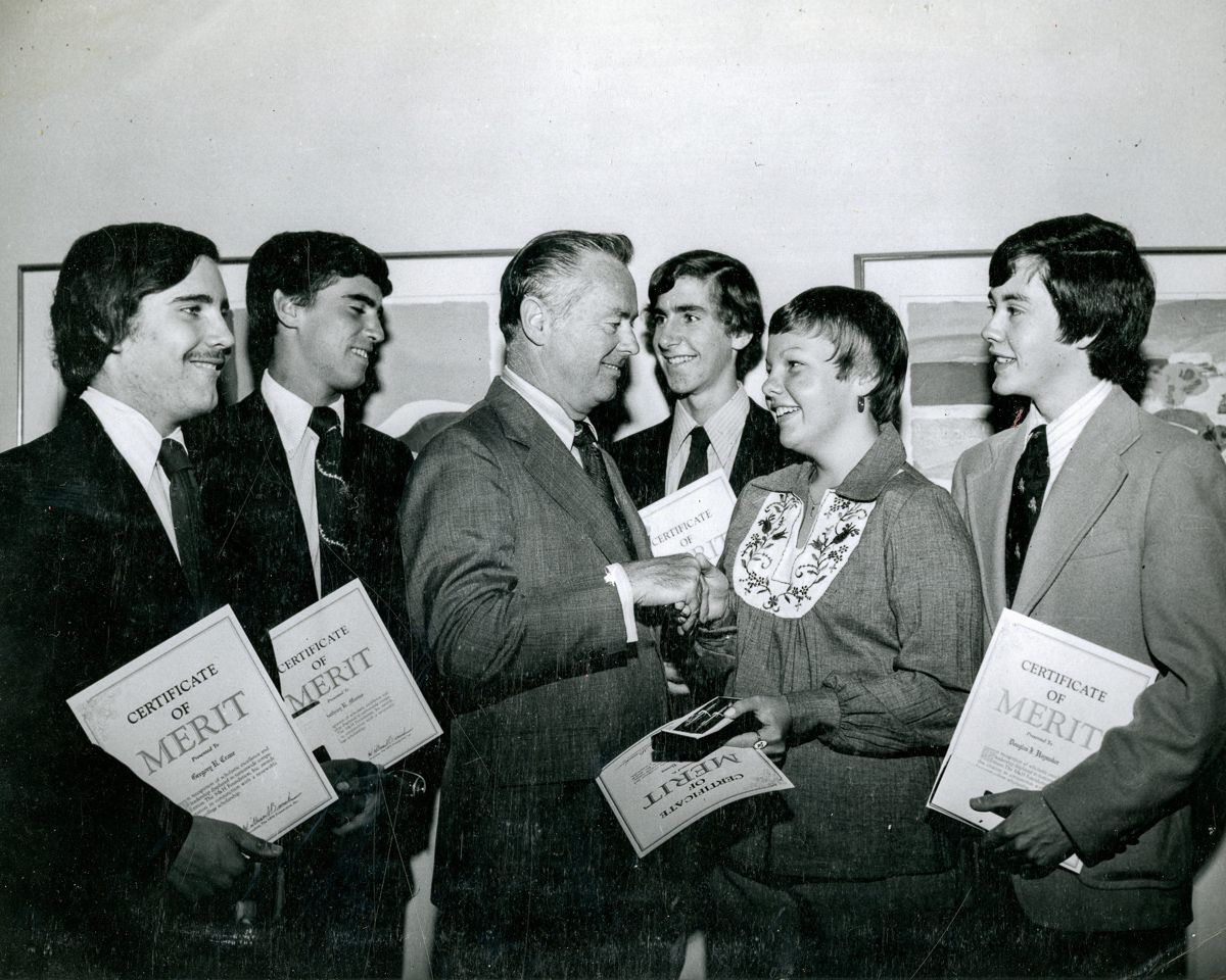 A group of teenagers being congratulated for their receiving of a Certificate of Merit.Collection