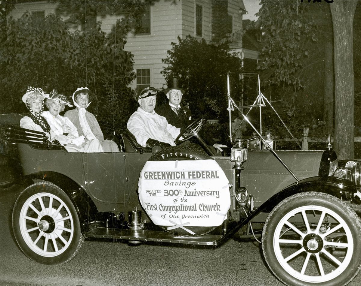 Five people in a car during a celebration of the 300th Anniversary of First Congregational Church's founding.Collection