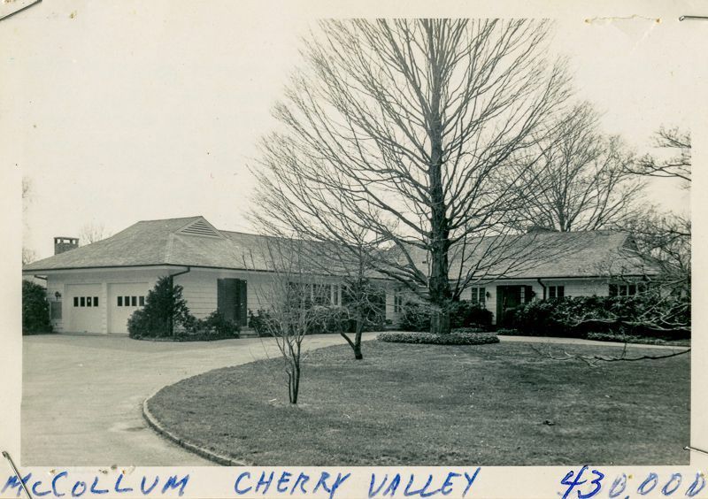 Ranch house built circa 1960 with a two door garage viewed from its driveway.