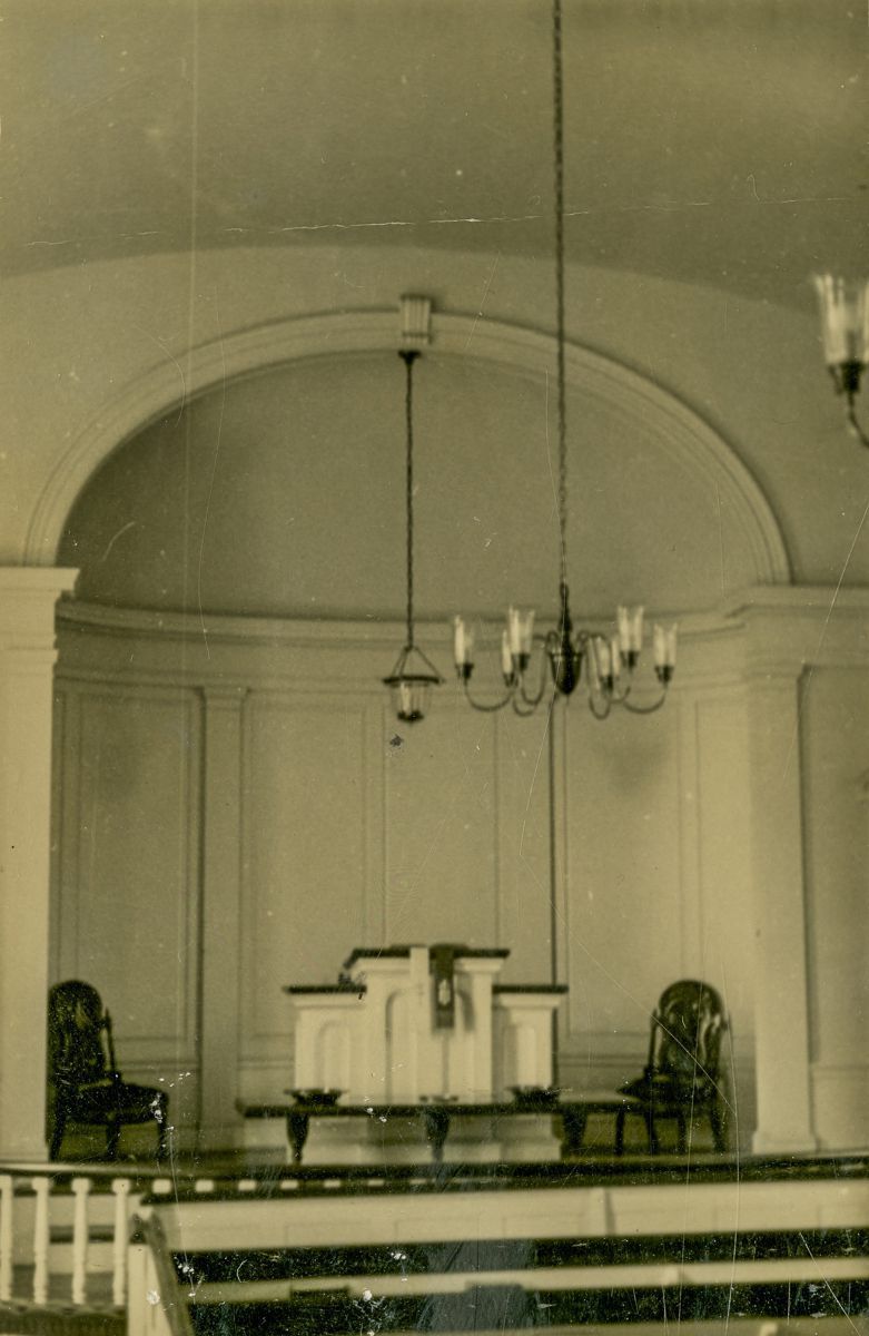 An interior view of the First Church of Round Hill looking towards its pulpit.Collection