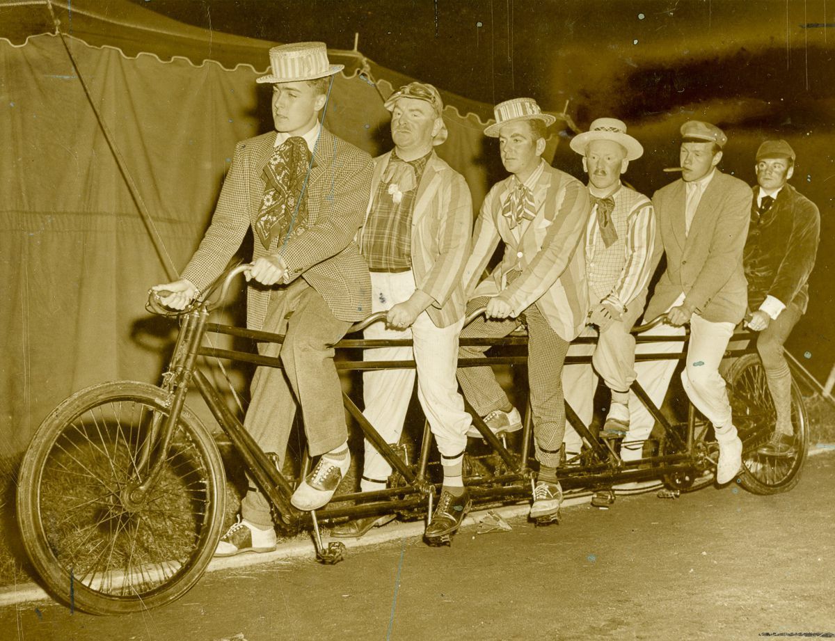 Six men on a tandem bicycle at an event celebrating the 300th Anniversary of Greenwich's Founding.Collection