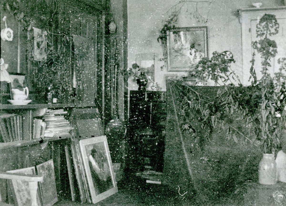 The bedroom of Elmer and Emma MacRae with a bed and numerous works by Elmer MacRae in it.