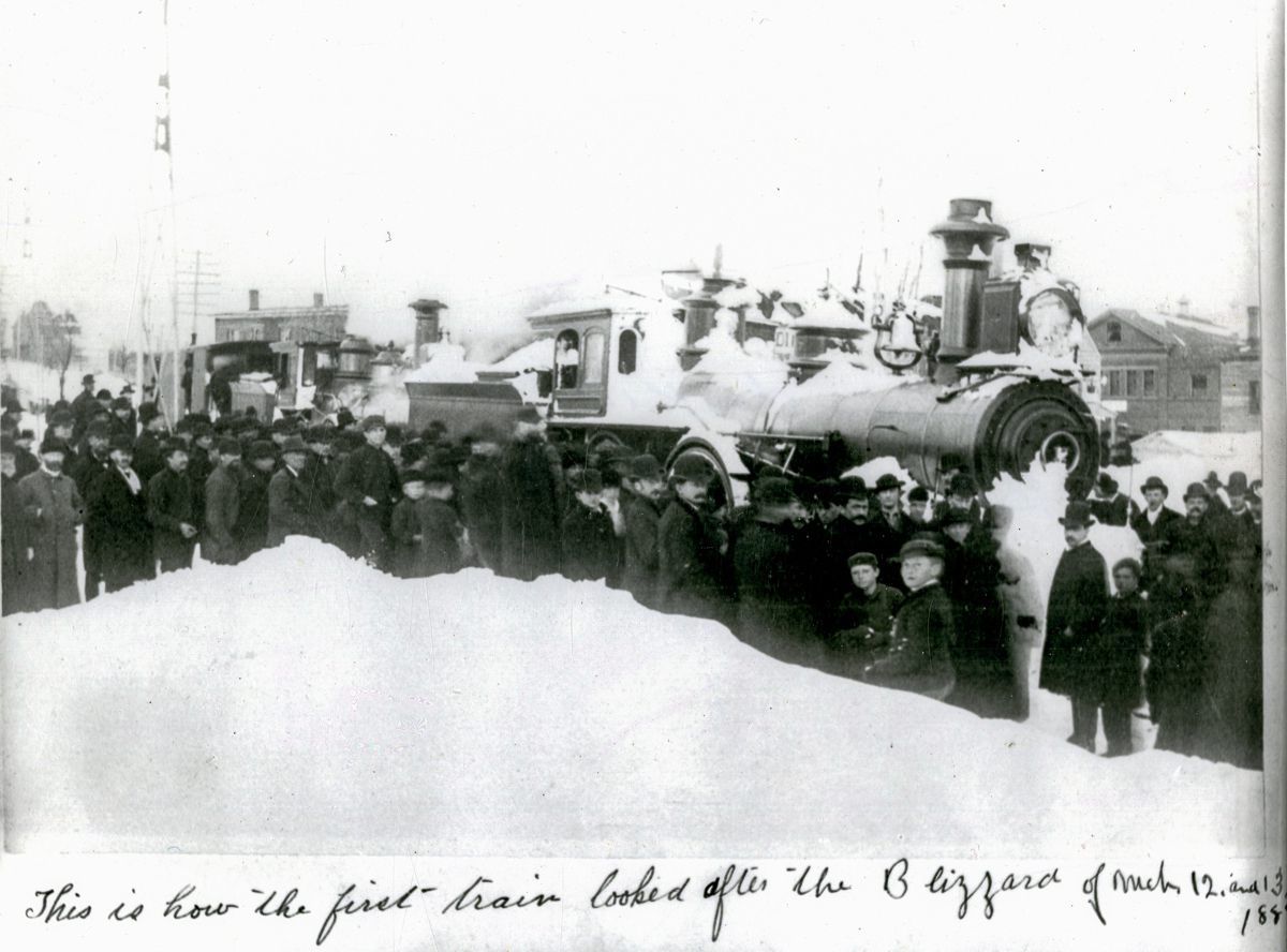 A group of people standing around a snowed-in locomotive after the March 12th and 13th Blizzard of 1888.Collection