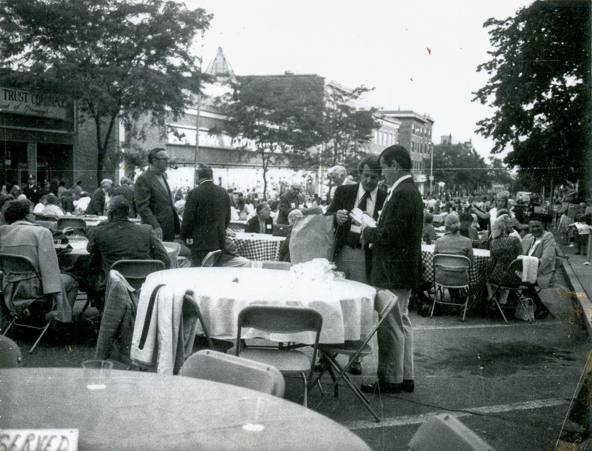 People attending an event in front of Saint Mary Church, sitting at tables on Greenwich Avenue.