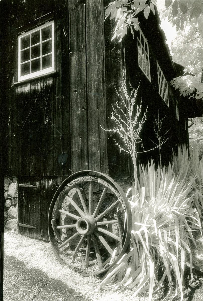 A wagon wheel leaning against the barn on the Greenwich Historical Society's campus.