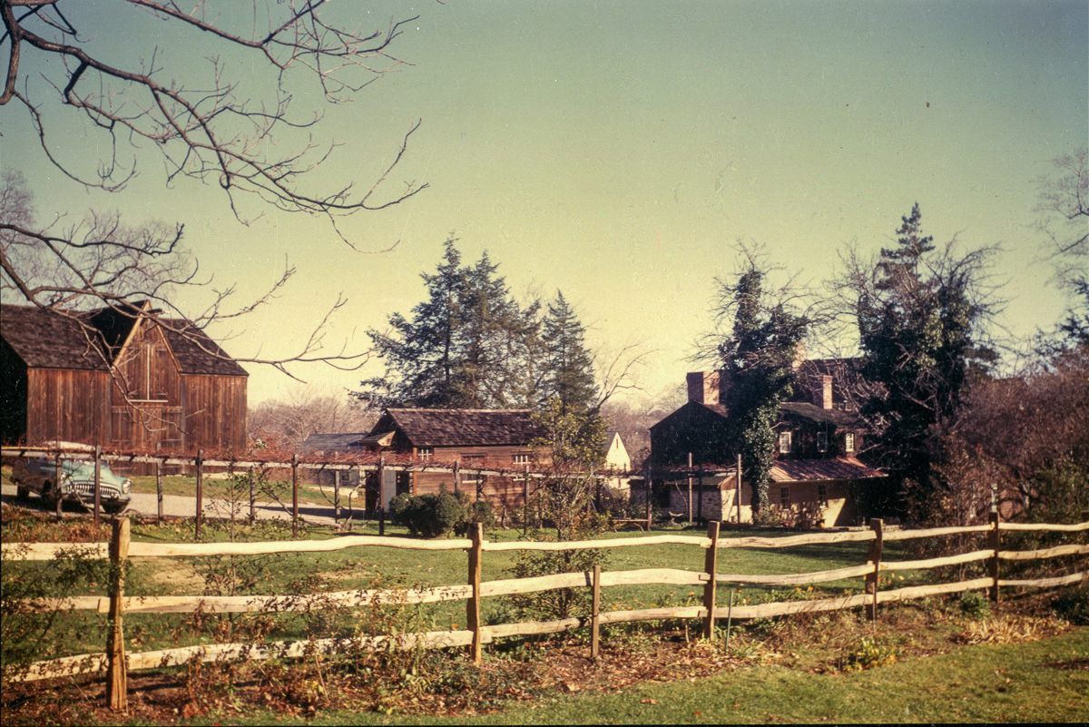 A view of the rear of the Bush-Holley House, the shed, barn and lawn.
