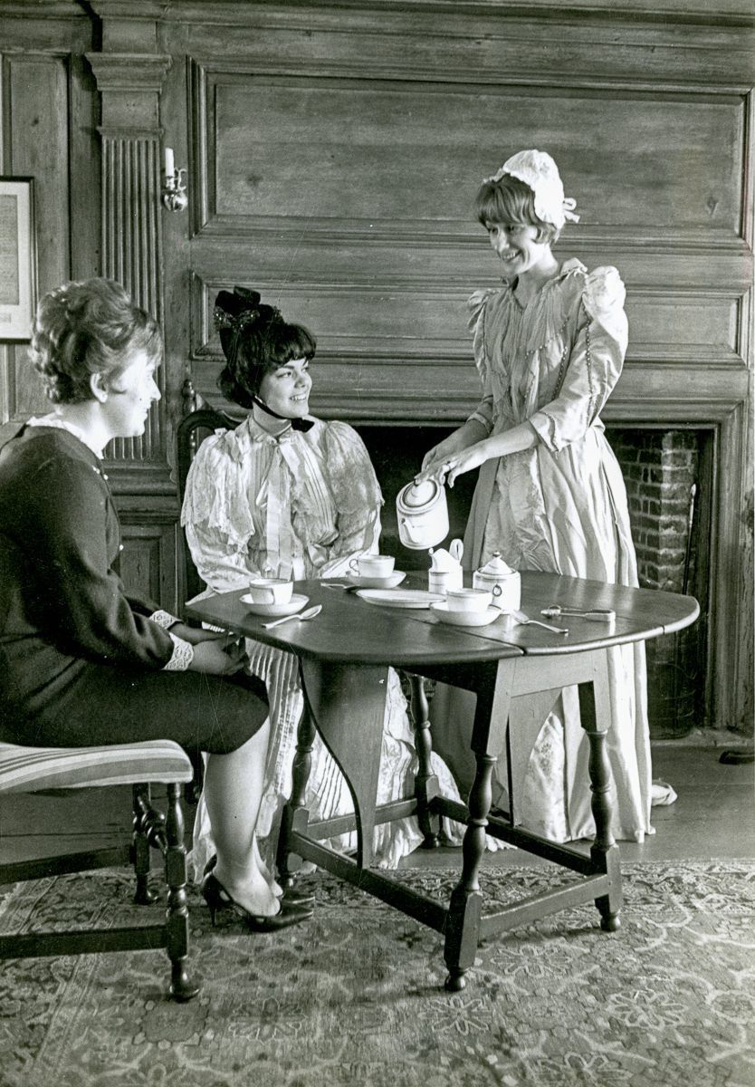 Two women in period costume and another woman in contemporary (1960's) clothing posing for a "tea party" in the parlor of the Bush-Holley House.Collection