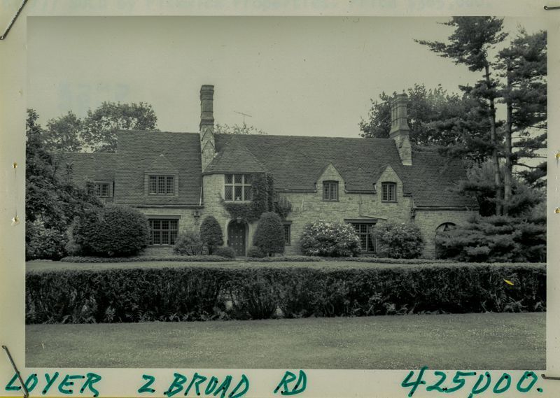 Norman-style stone house built in the 1930's viewed from its lawn.