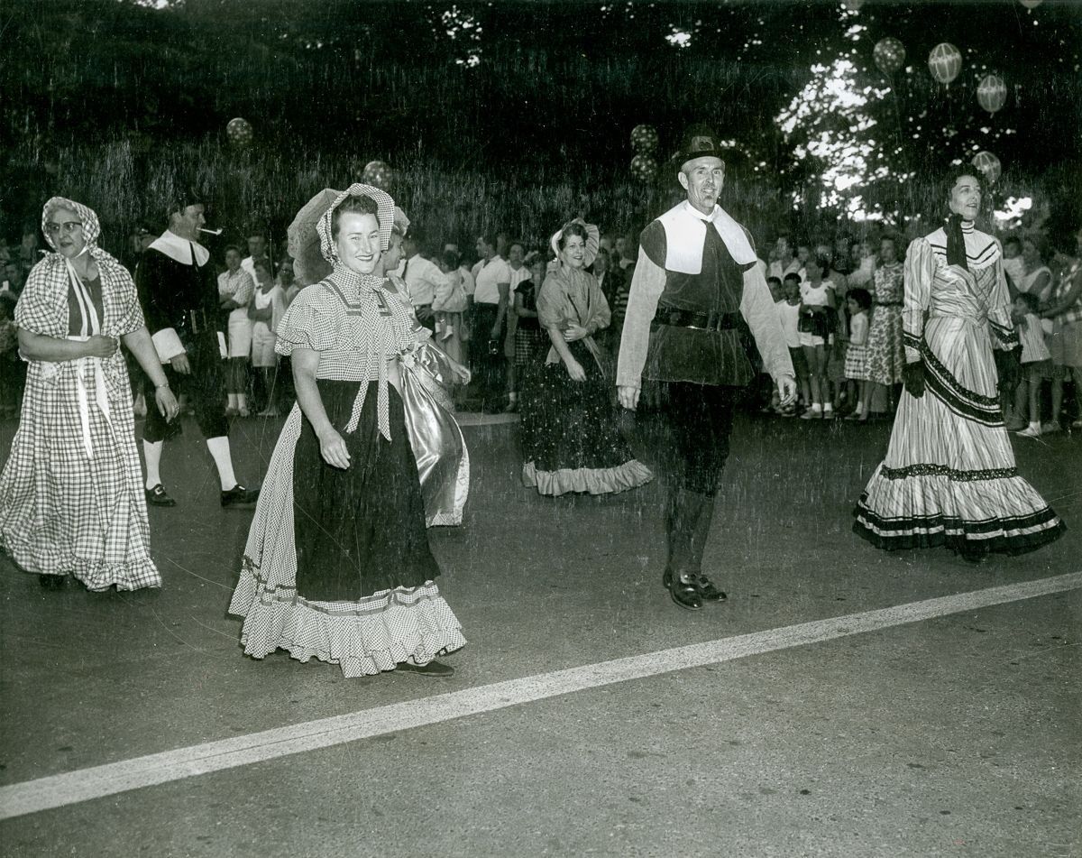 People in Colonial-era costume marching in the parade for Connecticut's Tercentenary.