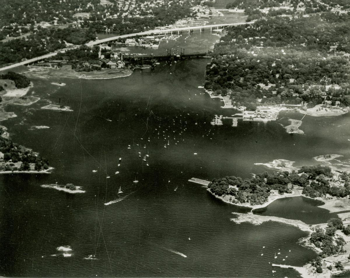 Aerial view looking north up Cos Cob harbor towards Interstate 95 and the Cos Cob railroad bridge.Collection