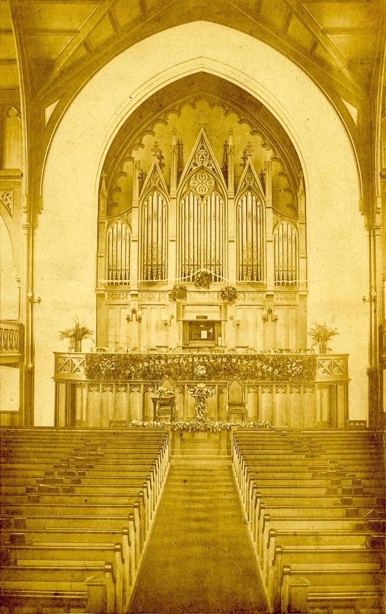 Interior of Second Congregational Church, looking towards the altar, prior to 1902 alterations.Collection