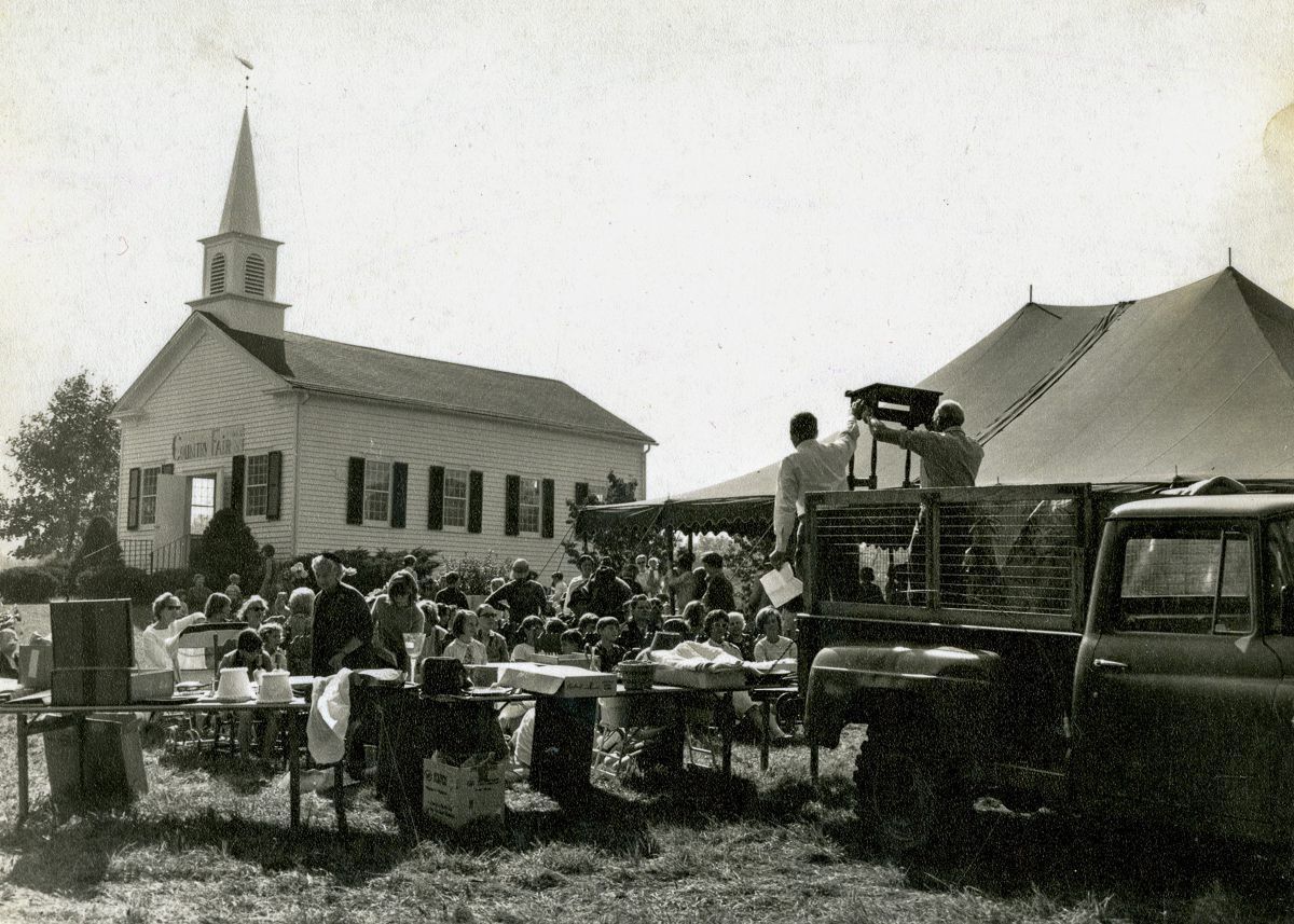 People attending an auction outside of Dingletown Community Church. The people running the auction can be seen standing in the bed of a pick-up truck holding up a table.Collection