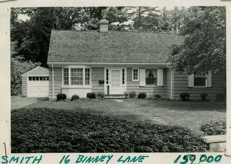 Shingled Ranch house built in the 1950's with a garage viewed from its front lawn.