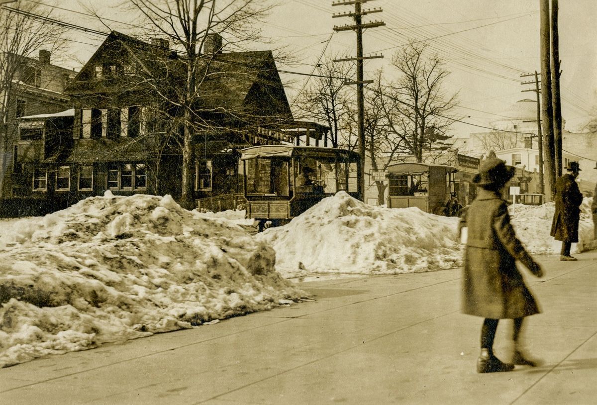 View of 276-278 Greenwich Avenue in the winter with two cars/vehicles driving up the road in the foreground.Collection