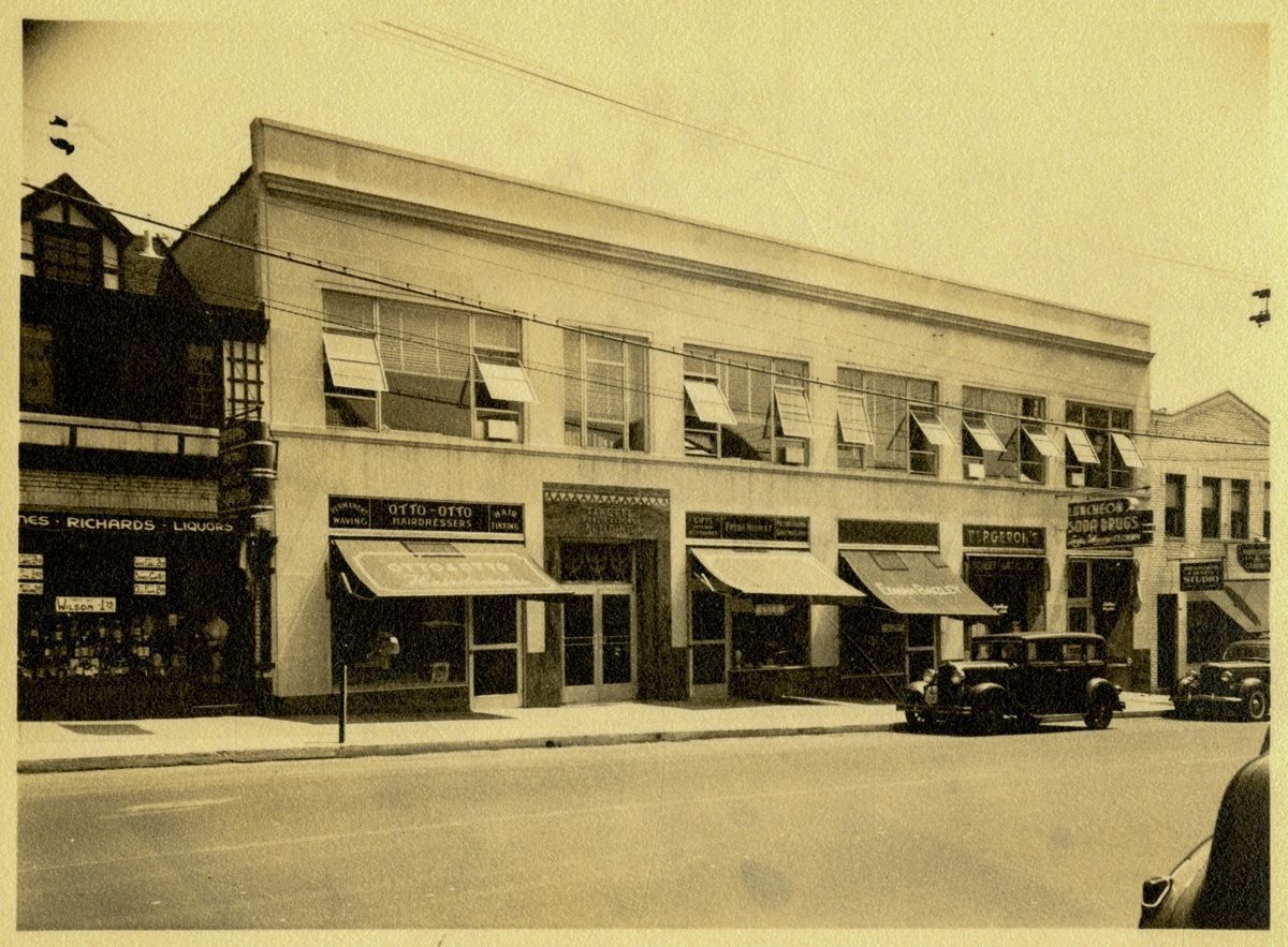 View from across the street of the Fawcett Publications Building and its storefronts.Collection