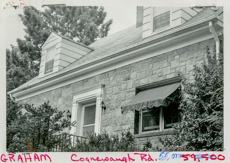 Cape Cod built circa 1949 with stone walls and two small dormers viewed from its lawn, close to its front door.Collection