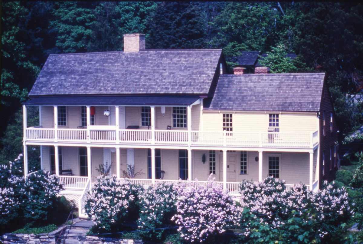 The exterior of Bush-Holley House with its lilac bushes in bloom, viewed from an elevated position.