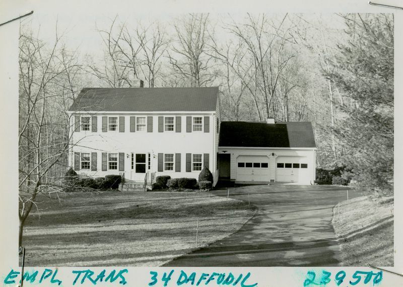 Colonial-style house built in 1966 with a two door garage viewed from its driveway.