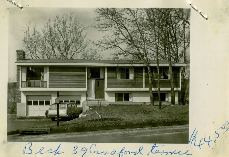Raised ranch built in 1964 with a two door garage viewed from the street.