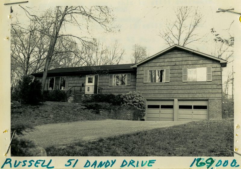 Ranch house built circa 1963 with a two door garage and shingle siding viewed from its lawn.