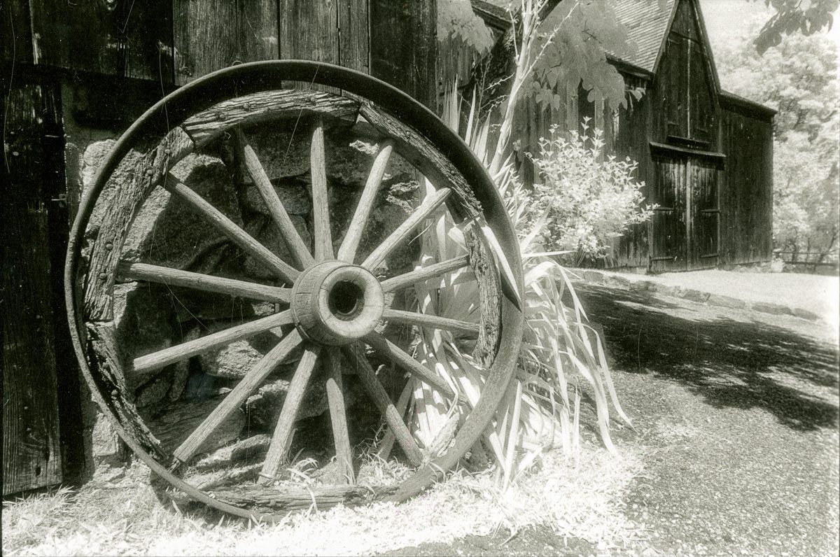 A wagon wheel leaning against the barn on the Greenwich Historical Society's campus.