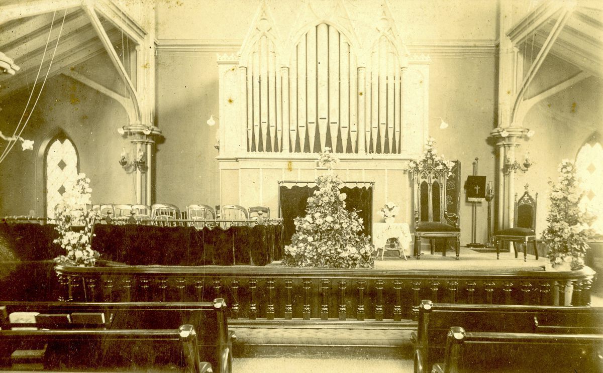 The organ and pulpit of the First United Methodist Church decorated with flowers.Collection
