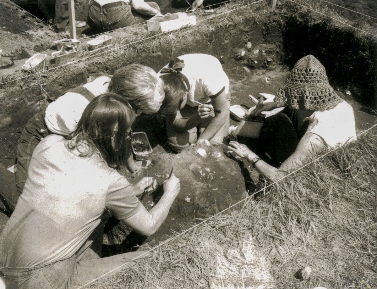 Image of four archaeologists in a trench using brushes for detailed excavation of in situ artifacts.Collection